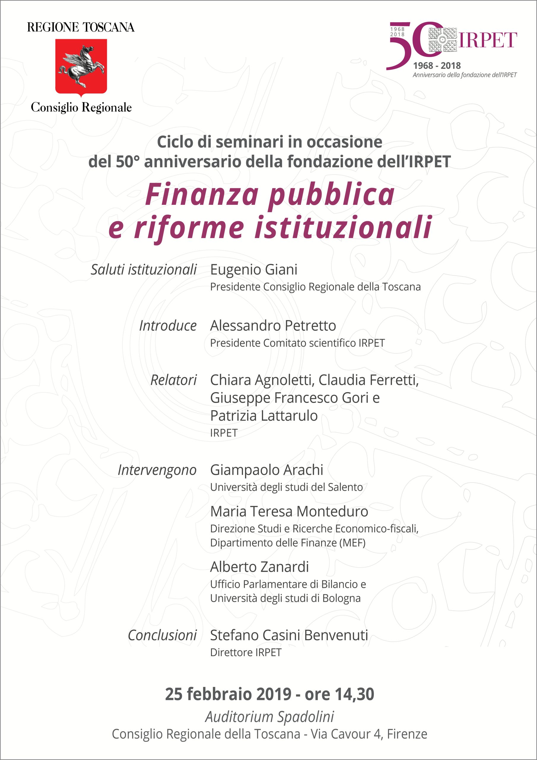 - “Finanza pubblica e riforme istituzionali” con Giampaolo Arachi (Università del Salento), Maria Teresa Monteduro (Direzione Studi e Ricerche Economico-fiscali, Dipartimento delle Finanze MEF) e Alberto Zanardi (Ufficio parlamentare di bilancio e Università di Bologna). Lunedì 25 febbraio 2019, Firenze, Auditorium Spadolini, Via Cavour 4, ore 14.30
